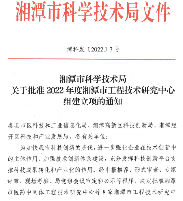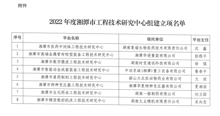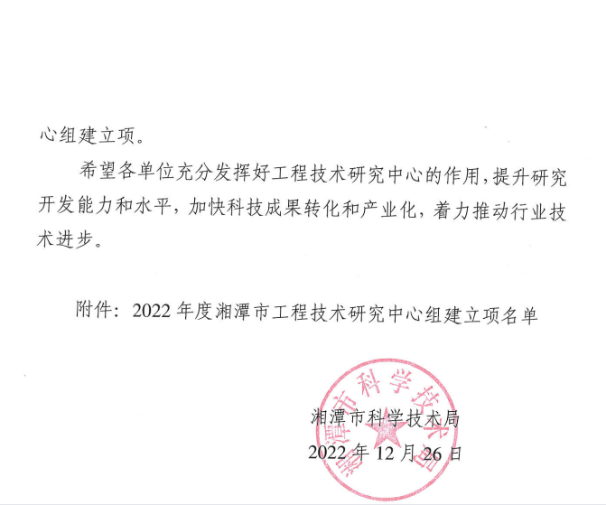 2022年12月27日,湘潭市科技局發布了關于批準2022年度湘潭市工程技術研究中心組建立項的通知,經申報推薦、形式審查、專家評審、現場考察、局黨組會議審定和公示等程序,決定批準湘潭華進重裝有限公司等8家湘潭市工程技術研究中心組建立項。