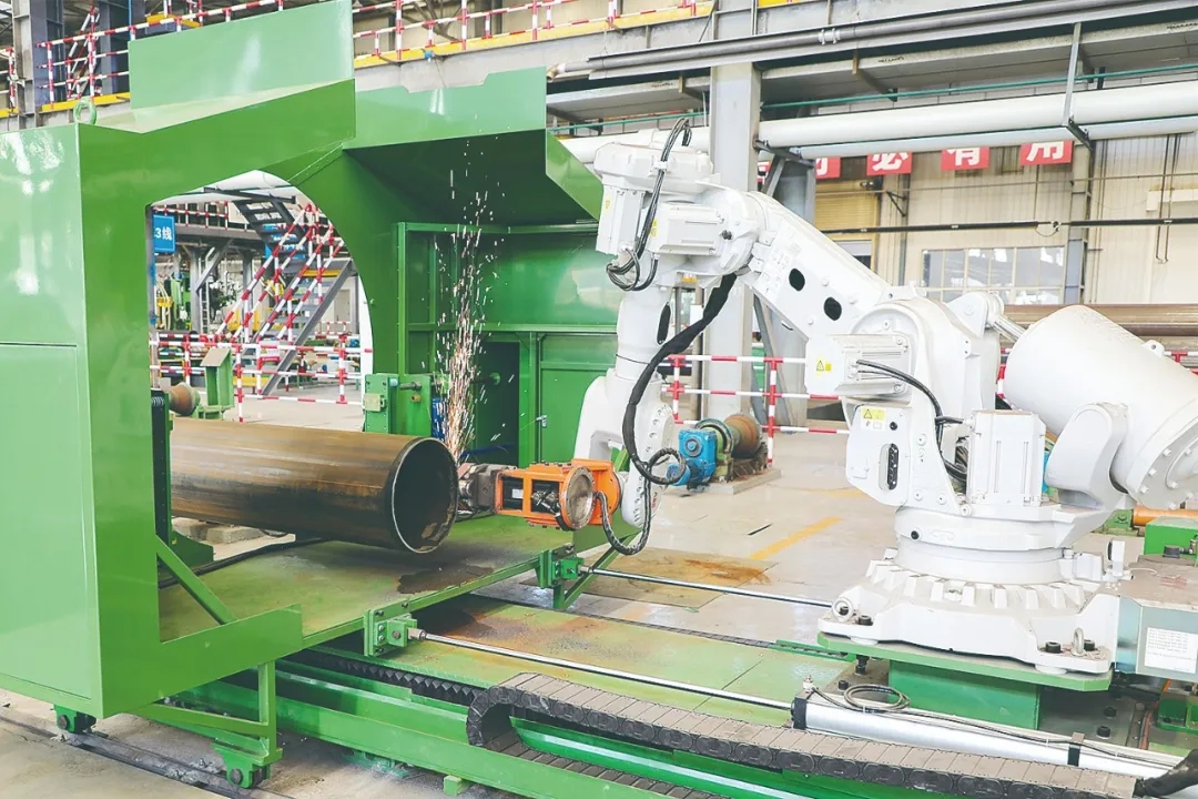 新能源管材生產線機器人正在修磨直縫管管端焊縫。通訊員 李少波 攝